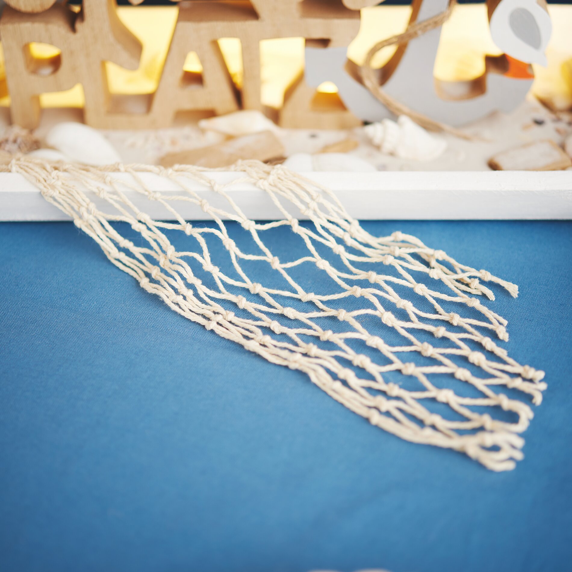Befestige das Fischernetzband am Rand des Tabletts, um das maritime Thema abzurunden.