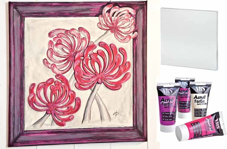 Unterstützt von dem MDF-Dekor Chrysanthemen erhält dieser wunderschön bemalte Keilrahmen noch einen 3D-Effekt. Mit unserer Material-Liste und der Anleitung zum Download schaffen Sie das auch.