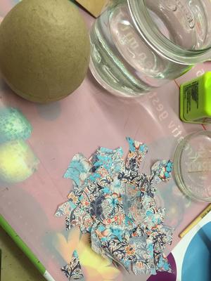 Weiter geht’s es mit dem Bekleben. Hierzu streicht ihr das Ei, an der Stelle, die ihr bekleben wollt großzügig mit dem Kleber ein. Dann klebt ihr immer wieder ein Stückchen von den zuvor zerrissenen Papier auf. Achtet hierbei besonders darauf, dass wirklich jedes Stück wieder mit Kleber bedeckt ist. Frei nach dem Motto, „viel hilft viel“ .Der viele Kleber ist nötig, da das  Papier keinen Kleber durch lässt und somit ohne nicht von allein hält. So würden später dann Unebenheiten entstehen. Benutzt Ihr aber genug Kleber und arbeitet sorgfältig, erzielt ihr ganz leicht ein tolles Ergebnis.
