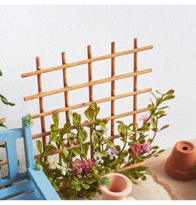 To give the miniature garden a natural look, mix some brown paint with water. Paint the plant trellis and miniature wooden fruit steps with this mixture and leave to dry completely. The diluted paint ensures that the wood structure remains visible and gives the parts an authentic and natural look.