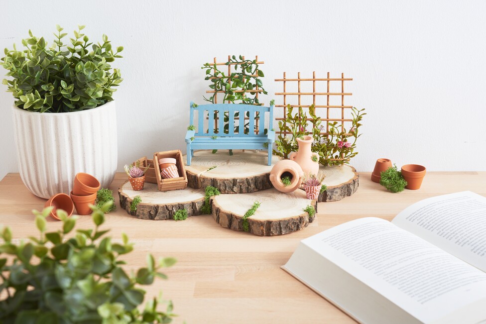 The VBS "Round" tree slices are now joined together with hot glue. As soon as the glue has dried, they form a stable base for the other decorative elements: place the decorative elements you have made, such as the garden bench, terracotta pots and flower trellis, on the tree discs according to your personal ideas and also fix everything in place with hot glue. To complete the overall picture, you can attach moss in various places at the end.