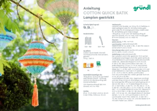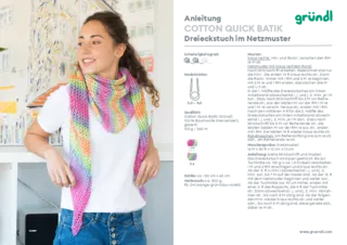 Die Gründl Cotton Quick Batik Wolle mit farbenfrohen Langrapport-Druck hat ein Gewicht von ca. 100 g und eine Lauflänge von ca. 260 m. Das pflegeleichte Garn aus 100 % mercerisierter Baumwolle ist angenehm auf der Haut zu tragen und hält bei wärmeren Temperaturen schön kühl. Es lässt sich idealerweise mit einer Nadelstärke von 3 – 4 verarbeiten.