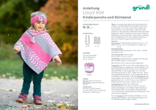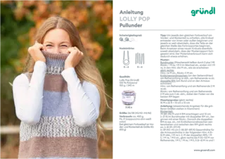 Gründl Wolle "Lolly Pop" wird als 150 g Knäuel und mit einer Lauflänge von ca. 240 m geliefert. Zum Anfertigen eines Pullovers in Größe 38 benötigt man ca. 600 g und für ein Dreieckstuch ca. 450 g. Es wird zum Stricken und Häkeln eine Nadel in Stärke 5 – 6 mm empfohlen.