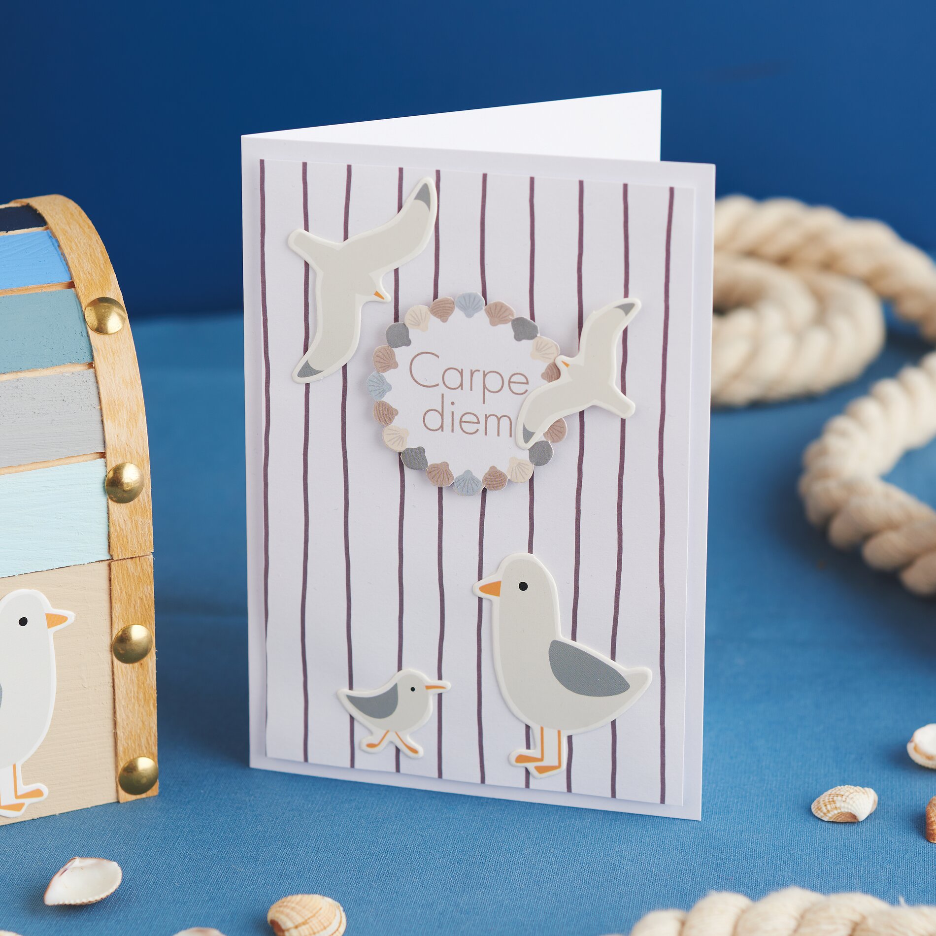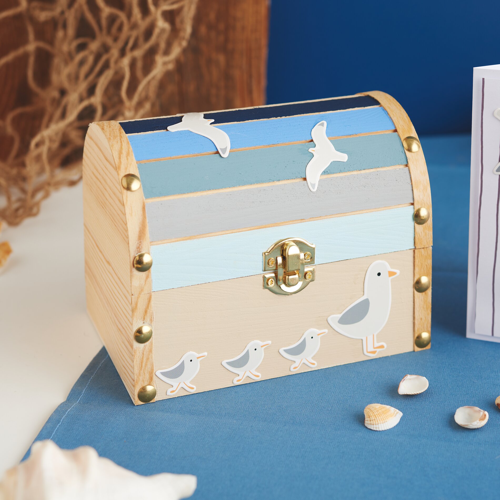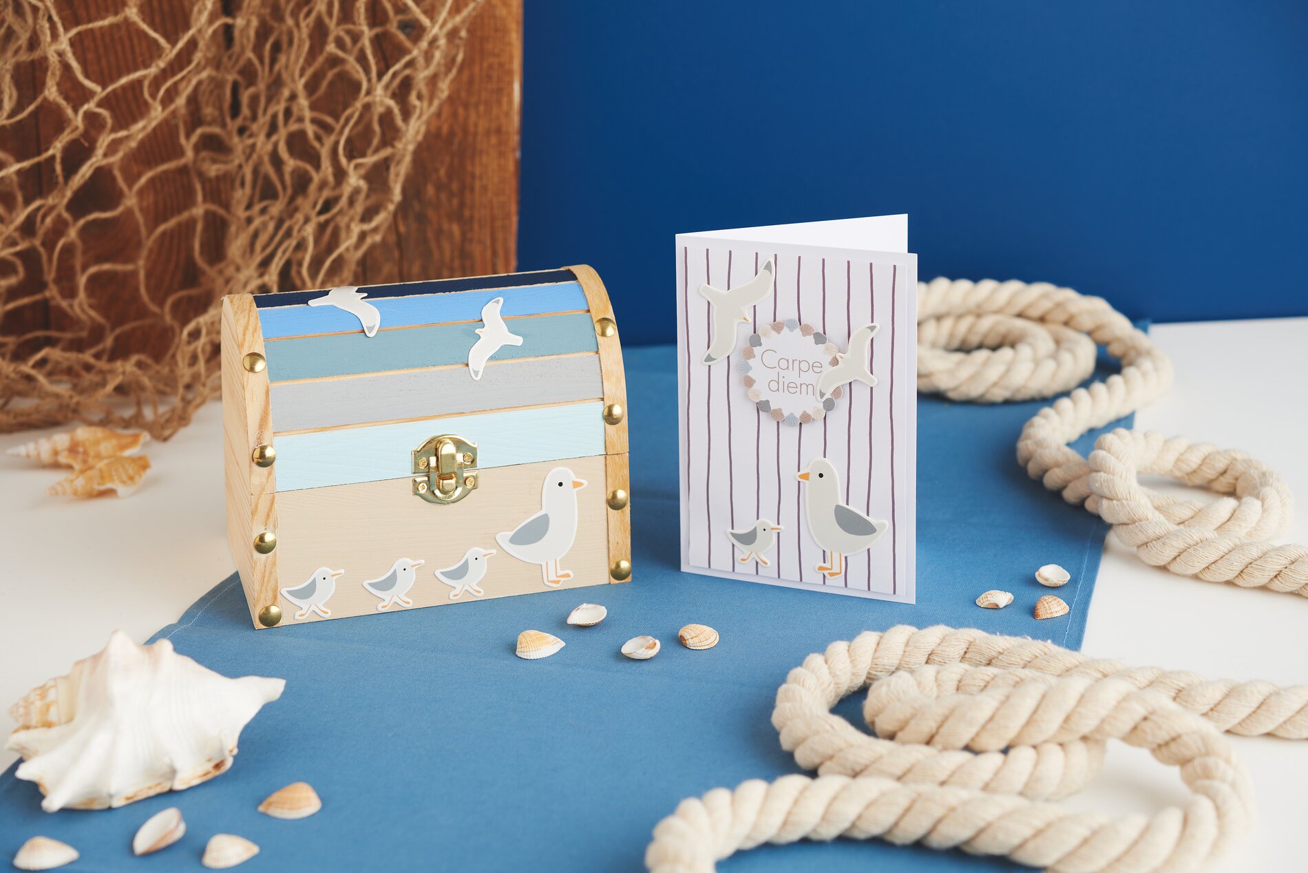 Mit dieser Inspirationsidee gestaltest du eine Runddeckeltruhe aus Holz und eine passende Karte im harmonischen maritimen Look. Ideal als Geschenk, zur Aufbewahrung kleiner Schätze oder als liebevolles DIY-Projekt für zwischendurch. Die Kombination aus Bastelfarben, Paper Shapes und 3D-Effekten sorgt für Tiefe und einen individuellen Stil – perfekt für alle, die gern kreativ basteln und gestalten.