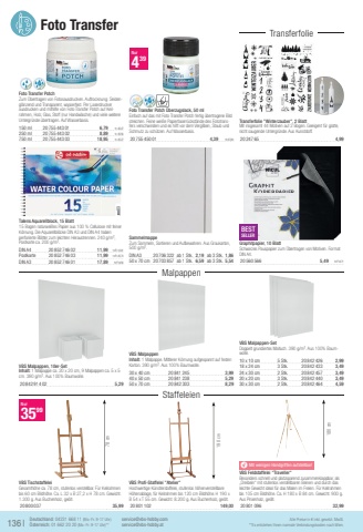 136 |Alle Preise in %u20ac inkl. gesetzl. MwSt.Deutschland: 04231 668 11 (Mo.-Fr. 9-17 Uhr)%u00d6sterreich: 01 662 20 20 (Mo.-Fr. 9-17 Uhr)**service@vbs-hobby.comservice@vbs-hobby.at**Es entstehen Ihnen normale Verbindungskosten nach Wien.Foto Transfer PotchZum %u00dcbertragen von Fotosausdrucken. Auftrocknung: Seidengl%u00e4nzend und Transparent, wasserfest. Per Laserdrucker ausdrucken und mithilfe von Foto Transfer Potch auf Keilrahmen, Holz, Glas, Stoff (nur Handw%u00e4sche) und viele weitere Untergr%u00fcnde %u00fcbertragen. Auf Wasserbasis.150 ml20755 443 016,791l=45,27250 ml20755 443 028,891l=35,56750 ml20755 443 0318,951l=25,27Foto Transfer Potch %u00dcberzugslack, 50 mlEinfach auf das mit Foto Transfer Potch fertig %u00fcbertragene Bild streichen. Feine wei%u00dfe Papierfaserr%u00fcckst%u00e4nde des Fototransfers verschwinden und es hilft vor dem Vergilben, Staub und Schmutz zu sch%u00fctzen. Auf Wasserbasis.20755 450 014,391l=87,80Nur439Transferfolie \Mit insgesamt 44 Motiven auf 2 Bogen. Geeigent f%u00fcr glatte, nicht saugende Untergr%u00fcnde. Aus Kunststoff.20247 654,99Talens Aquarellblock, 15 Blatt15 Bogen naturwei%u00dfes Papier aus 100 % Cellulose mit feiner K%u00f6rnung. Die Aquarellbl%u00f6cke DIN A3 und DIN A4 haben perforierte Bl%u00e4tter zum leichten Heraustrennen. 240 g/m%u00b2, Postkarte ca. 200 g/m%u00b2.DIN A420852 746 0211,991m%u00b2=12,81Postkarte20852 746 0311,991m%u00b2=25,73DIN A320852 746 0117,891m%u00b2=9,56SammelmappeZum Sammeln, Sortieren und Aufbewahren. Aus Graukarton, 500 g/m%u00b2.DIN A320706 322ab 1 Stk.2,19ab 3 Stk.1,8650 x 70 cm20703 857ab 1 Stk.6,59ab 3 Stk.5,54BESTSELLERGraphitpapier, 10 BlattSchwarzes Pauspapier zum %u00dcbertragen von Motiven. Format DIN A4.20560 5665,491m%u00b2=8,71VBS Malpappen, 10er-SetInhalt: 1 Malpappe ca. 20 x 20 cm, 9 Malpappen ca. 5 x 5 cm. 390 g/m%u00b2. Aus 100% Baumwolle.20842 914 025,29VBS MalpappenInhalt: 1 Malpappe. Mittlerer K%u00f6rnung aufgespannt auf festen Karton. 390 g/m%u00b2. Aus 100% Baumwolle.30 x 40 cm20841 2453,9940 x 50 cm20841 2385,2950 x 70 cm20842 3038,29VBS Malpappen-SetDoppelt grundiertes Maltuch. 390 g/m%u00b2. Aus 100% Baumwolle.10 x 10 cm5 Stk.20842 4262,9918 x 24 cm3 Stk.20842 4333,4924 x 30 cm2 Stk.20842 4573,4920 x 20 cm3 Stk.20842 4403,4930 x 30 cm2 Stk.20842 4644,59VBS TischstaffeleiGesamth%u00f6he ca. 78 cm, stufenlos verstellbar. F%u00fcr Keilrahmen bis 60 cm Bildh%u00f6he. Ca. L 32 x B 27,2 x H 78 cm. Gewicht: 1.300 g. Aus Buchenholz, ge%u00f6lt.20800 03735,99Nur3599VBS Profi -Staffelei \Hochwertige K%u00fcnstlerstaffelei, stufenlos h%u00f6henverstellbare H%u00f6henablage, f%u00fcr Keilrahmen bis 120 cm Bildh%u00f6he. H 190 x B 54 x T 55 cm. Gewicht: 8.200 g. Aus Buchenholz, ge%u00f6lt.20801 102149,00yMit wenigen Handgriffen aufstellbar!VBS Feldstaffelei \Besonders schnell und platzsparend zusammenklappbar, als %u201eDreibein%u201c mit stufenlos verstellbaren Beinen und durch das leichte Gewicht ideal f%u00fcr das Malen im Freien. F%u00fcr Keilrahmen bis 105 cm Bildh%u00f6he. Ca. H 180 x B 84 cm. Gewicht: 900 g. Aus Pinienholz, ge%u00f6lt.20801 09632,99 Foto Transfer Transferfolie Staffeleien 78 cm 190 cm 180 cm Malpappen
