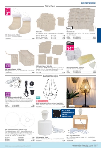 VBS Nikolausstiefel, 2 St%u00fcckCa. L 19 x B 15 cm. Aus Polyester.20239 873,99VBS BeutelMit Zugb%u00e4ndern. Aus 50 % Baumwolle und 50 % Polyester.B 19 x H 26 cm2 Stk.20117 202,49B 13 x H 19 cm6 Stk.20117 254,29B 7 x H 9 cm24 Stk.20117 296,99VBS JutebeutelMit Zugb%u00e4ndern. Ca. L 16 x B 11 cm. Aus 50 % Baumwolle und 50 % Polyester.25 Stk.20418 362 0110,99100 Stk.20418 362 5034,99BESTSELLERVBS Baumwollbeutel, 12 St%u00fcckMit Zugb%u00e4ndern. Ca. L 15 x B 10 cm. Aus 100 % Baumwolle.20304 4509,99VBS Beutel \Mit Zugb%u00e4ndern. Inhalt: 14 Beutel ca. B 12 x H 16 cm, 10 Beutel ca. B 13 x H 19 cm und 1 Beutel ca. B 19 x H 26 cm. Aus 50 % Baumwolle und 50 % Polyester.20117 4112,99VBS Organzas%u00e4ckchen, 100 St%u00fcckCa. L 12 x B 7,5 cm. Aus Polyester.Wei%u00df20418 324 0114,99Creme20418 324 0214,99BESTSELLERVBS Lampen-Anschluss-Set E27F%u00fcr Lampen mit E27-Fassung. Mit Schalter und Stecker. Schraubring zum Befestigen des Schirmes und Gewinder%u00f6hrchen zum Befestigen auf dem Lampenfu%u00df. Kabell%u00e4nge ca. 1,90 m.Wei%u00df20240 086 807,49Schwarz20240 086 6010,49NEUyf%u00fcr E27-FassungenMetall-Lampenschirmrahmen, schwarz beschichtet%u00d8 oben ca. 6 cm, %u00d8 unten ca. 15 x H ca. 24 cm. Aus Metall.20270 709,99VBS Lampenschirmringe \F%u00fcr individuelle Lampen mit E27-Fassung. Eignet sich als Steh- oder H%u00e4ngelampe. Packungen mit 2 Ringen: 1 Ring mit Innenteil zur Befestigung an der Fassung und 1 Ring ohne Innenteil. Inkl. Anleitung. Aus wei%u00dfem Metall.%u00d8 20 cm20240 9645,99%u00d8 30 cm20240 9887,79%u00d8 40 cm20241 00811,99VBS Lampenfu%u00df \Mit E27 Lampenfassung. %u00d8 ca. 8,5 x H 17 cm. Aus Keramik.20236 189,99VBS Lampenfu%u00df \Inkl. E14-Fassung, Kabel und Schalter. Ca. L 14 x B 9,5 x H 19,5 cm. Aus Holz.20689 69423,99Dekobeispiel2 St%u00fccknur399b100 St%u00fccknur1499Grundmaterial| 57www.vbs-hobby.comErl%u00e4uterungen zu Icons und Artikeleigenschaften auf S. 181 Lampendesign S%u00e4ckchen ALLES ZUMLAMPENDESIGNONLINEENTDECKEN