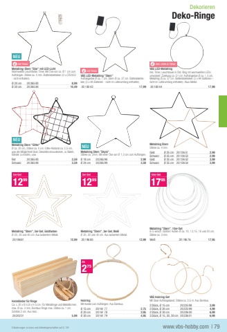 NEUymit TimerMetallring-Stern \Warmwei%u00dfe Leuchtfarbe. Timer. Mit %u00d6se von ca. %u00d8 1 cm zum Aufh%u00e4ngen. St%u00e4rke ca. 4 mm. Batteriebetrieben (2 x CR2302 - nicht enthalten).%u00d8 20 cm20265 838,99%u00d8 30 cm20265 8410,49yinkl. LEDs & TimerVBS LED-MetallringInkl. Timer, Leuchtsauer 6 Std. Ring mit warmwei%u00dfen LEDs umwickelt. Zuleitung ca. 51 cm. Aufh%u00e4nge%u00f6se %u00d8 ca. 1,3 cm, Metallring %u00d8 ca. 37 cm. Batteriebetrieben (3 x AA Batterien %u2013 nicht im Lieferumfang enthalten). Aaus Metall.20180 4417,99Metallring \%u00d8 20, 30 und 40 cm. Aus lackiertem Metall.20196 8112,99NEUMetallring Stern \%u00d8 ca. 20 cm, St%u00e4rke ca. 4 cm. Gitter-Abstand ca. 2,5 cm, was die M%u00f6glichkeit l%u00e4sst, Dekoteile einzustecken, zu f%u00e4deln, B%u00e4nder zu knoten, usw.Rot20265 933,59Schwarz20265 943,59NEUMetallring Stern \St%u00e4rke ca. 2mm. Mit einer %u00d6se von %u00d8 1,3 cm zum Aufh%u00e4ngen.%u00d8 18 cm20265 982,99%u00d8 24 cm20265 993,59ymit TimerVBS LED-Metallring \Aufh%u00e4nge%u00f6se %u00d8 ca. 1 cm, Stern-%u00d8 ca. 37 cm. Batteriebetrieben (3 x AA Batterien - nicht im Lieferumfang enthalten).20180 4317,99Holzst%u00e4nder f%u00fcr RingeCa. L 20 x B 4,8 x H 5 cm. F%u00fcr Metallringe und Metallformen max. %u00d8 ca. 3 mm, Bambus-Ringe max. St%u00e4rke ca. 1 cm. Schlitze 2 cm. Aus Holz.20202 315,99Metallring \%u00d8 20, 30 und 40 cm. Aus lackiertem Metall.20196 8012,99Metallring \In 5 versch. Gr%u00f6%u00dfen: Au%u00dfen-%u00d8 ca. 10, 12,15, 18 und 20 cm, St%u00e4rke ca. 3 mm.Wei%u00df20196 7617,95Metallring SternSt%u00e4rke ca. 4 mm.Gold%u00d8 25 cm20126 512,99Schwarz%u00d8 25 cm20126 532,99Gold%u00d8 35 cm20126 523,99Schwarz%u00d8 35 cm20126 543,99HolzringMit Kordel zum Aufh%u00e4ngen. Aus Bambus.%u00d8 15 cm20161 772,75%u00d8 20 cm20161 783,95%u00d8 30 cm20161 794,95VBS Holzring-SetMit Sisal-Aufh%u00e4ngeband. St%u00e4rke ca. 3,5 m. Aus Bambus.2 St%u00fcck, %u00d8 15 cm20225 983,992 St%u00fcck, %u00d8 20 cm20225 994,992 St%u00fcck, %u00d8 30 cm20226 006,993 St%u00fcck, %u00d8 15, 20, 30 cm20226 016,99 Deko-Ringe 3er-Set12993er-Set129910er-Set1795Ab275Dekorieren| 79www.vbs-hobby.comErl%u00e4uterungen zu Icons und Artikeleigenschaften auf S. 181