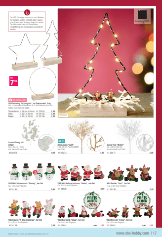 yinkl. LichterketteVBS Dekoring \Inkl. Lichterhkette. Batteriefach f%u00fcr 2 AA Batterien (nicht enthalten). Aus Holz und Metall.TannenbaumL 14,5 x H 26 cm41270 047,49SternL 20 x H 22 cm41241 057,49BogenL 20 x H 22 cm41241 067,49VBS Mini Elch \Ca. 4 cm. Aus Polyresin.41206 434,993,99Mini Rentier \H ca. 3 cm. Aus Polyresin.41241 592,49VBS Mini Weihnachtsmann \Ca. 3,5 cm. Aus Polyresin.41241 623,99VBS Figuren \Ca. 4,5 cm. Aus Polyresin. 41241 483,99VBS Mini Santa \Ca. 4 cm. Aus Polyresin.41206 424,993,99Nur749| 17www.vbs-hobby.comErl%u00e4uterungen zu Icons und Artikeleigenschaften auf S. 57DekobeispielVBS Mini Schneemann \Ca. 4 cm. Aus Polyresin.41241 643,99Zweig-Pick \Ca. L 38 x B 20 cm. Aus Kunststoff und Draht.41264 774,29NEUDeko Zweig \L ca. 38 cm. Aus Kunststoff und Draht.41266 744,49Lunaria Zweig mit GlitzerCa. L 45 x B 19 cm. Aus Kunststoff und Draht.41264 764,99Die VBS Dekoringe lassen sich nach Belieben mit Zweigen, Bl%u00fcten, Schleifen oder Figuren schm%u00fccken. Mehr Auswahl fi ndest du online!Der Holzsockel kann mit Bastelfarben, Handlettering und Brandmalerei versch%u00f6nert werden.-20%-20%Anleitung3506