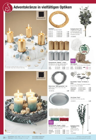 Dekobeispiel mit Weihnachtskugeln aus Glas von S. 15 und Kerzenhalter \26 |Alle Preise in %u20ac inkl. gesetzl. MwSt.Deutschland: 04231 668 11 (Mo.-Fr. 9-17 Uhr)%u00d6sterreich: 01 662 20 20 (Mo.-Fr. 9-17 Uhr)**service@vbs-hobby.comservice@vbs-hobby.at**Es entstehen Ihnen normale Verbindungskosten nach Wien.DekobeispielStrohkranzGebunden. Aus Naturmaterial.%u00d8 20 cm41603 2491,59%u00d8 30 cm41603 2632,09%u00d8 35 cm41603 2702,49%u00d8 40 cm41603 2873,19Eukalyptus Bund \3 Stiele, die mit Juteband als Strau%u00df gebunden sind. Ca. L 47 x B 22 cm. Aus Kunststoff und Draht.41264 937,69Stumpenkerzen \Brenndauer%u00a0ca. 36 Std. Zweifach getaucht. Ca. %u00d8 6 x H 10 cm. Made in Germany.Gold41212 5013,491Stk.=3,37Silber41212 5113,491Stk.=3,37BESTSELLERVBS FellbandB ca. 4 cm, L ca. 2 m. Aus 100 % Polyester. Wei%u00df41418 096 015,494,391m=2,19Braun41418 096 025,491m=2,75Reben-Kranz \Au%u00dfen-%u00d8 ca. 25 cm, H ca. 4 cm. Aus Naturmaterial.41237 223,69Zink Schale \Ca. %u00d8 32 x H 2,3 cm. Aus Zink.41237 213,49BESTSELLERStumpenkerzen \Brenndauer%u00a0ca. 25 Std. Durchgef%u00e4rbt. Ca. %u00d8 6 x H 8 cm. Made in Germany.Wollwei%u00df41212 528,991Stk.=2,25Eukalyptus41212 558,991Stk.=2,25Rubin41212 568,991Stk.=2,25Eukalyptus Zweig \L%u00e4nge ca. 80 cm. Aus Kunststoff und Draht.41254 624,99 Adventskr%u00e4nze in vielf%u00e4ltigen Optiken 80 cm Anleitung3509Anleitung3522Kerzenhalter \St%u00fcckH ca. 4,3 cm. Passend f%u00fcr Kerzen mit einem %u00d8 von ca. 6 cm. Aus Metall.Silberfarben41619 745 012,99Goldfarben41619 745 022,99Schwarz41184 422,99-20%