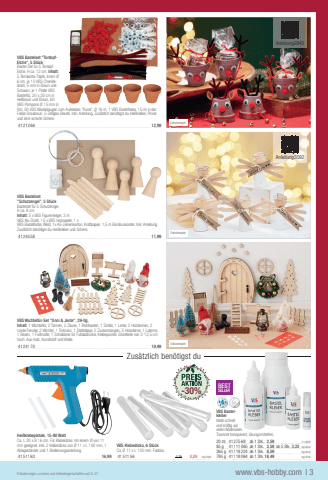 Hei%u00dfklebepistole, 15-80 WattCa. L 20 x B 16 cm. F%u00fcr Klebesticks mit einem %u00d8 von 11 mm geeignet. Inkl. 2 Klebesticks von %u00d8 11 x L 100 mm, 1 Ablagest%u00e4nder und 1 Bedienungsanleitung.41511 6316,99VBS Bastelset \Elche\Bastel-Set f%u00fcr 5 TontopfElche, H ca. 12 cm. Inhalt:5 Terrakotta-T%u00f6pfe, Innen-%u00d8 6 cm, je 10 VBS Chenilledraht, 5 mm in Braun und Schwarz, je 1 Platte VBS Bastelfi lz, 20 x 30 cm in Hellbraun und Braun, 60 VBS Pompons %u00d8 15 mm in Rot, 50 VBS Wackelaugen zum Aufkleben \Farbe Graubraun, 5 Zellglas-Beutel. Inkl. Anleitung. Zus%u00e4tzlich ben%u00f6tigst du Hei%u00dfkleber, Pinsel und eine scharfe Schere.41212 6612,99VBS Bastelset \, 5 St%u00fcckBastelset f%u00fcr 5 Schutzengel, H ca. 8 cm.Inhalt: 5 x VBS Figurenkegel, 3 m VBS Alu-Draht, 15 x VBS Holzspatel, 1 x VBS Bastelfarbe, Wei%u00df, 1x A5 Leinenkarton, Kraftpapier, 1,5 m Bambuskordel. Inkl. Anleitung. Zus%u00e4tzlich ben%u00f6tigst du Hei%u00dfkleber und Schere.41245 5811,99VBS Wichtelt%u00fcr-Set \Inhalt: 1 Wichtelt%u00fcr, 2 Tannen, 2 Z%u00e4une, 1 Briefkasten, 1 Schild, 1 Leiter, 2 Holztannen, 2 runde Fenster, 2 Wichtel, 1 T%u00fcrkranz, 1 Stiefelpaar, 2 Zuckerstangen, 5 Holzsterne, 1 Laterne, 1 Besen, 1 Fu%u00dfmatte, 1 Schablone f%u00fcr Fu%u00dfabdr%u00fccke, Klebepunkte. Einzelteile von 3-12,5 cm hoch. Aus Holz, Kunststoff und Wolle.41241 7019,99BESTSELLERVBS BastelkleberKlebt schnell und kr%u00e4ftig auf vielen Materialien. Trocknet transparent, l%u00f6sungsmittelfrei.20 ml41275 68ab 1 Stk.2,591l=129,5085 g41111 065ab 1 Stk.3,59ab 5 Stk.3,231kg=42,24265 g41118 224ab 1 Stk.8,591kg=32,42795 g41118 064ab 1 Stk.18,491kg=23,26Weihnachtswelt| 3www.vbs-hobby.comErl%u00e4uterungen zu Icons und Artikeleigenschaften auf S. 57Zus%u00e4tzlich ben%u00f6tigst du DekobeispielAnleitung2843DekobeispielDekobeispielAnleitung3092VBS Klebesticks, 6 St%u00fcckCa. %u00d8 11 x L 100 mm. Farblos.41511 563,292,291kg=50,89-30%