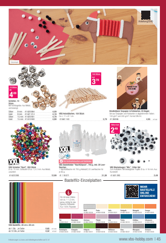 VBS Bastelfi lz, 20 cm x 30 cmab 1 Stk.Je Farbe0,651m%u00b2=10,83ab 10 Stk.Je Farbe0,521m%u00b2=8,67| 45www.vbs-hobby.comErl%u00e4uterungen zu Icons und Artikeleigenschaften auf S. 57DekobeispielWei%u00dfPuderGelbGoldgelbMaisgelbOrange41650 120 3841650 120 0841650 120 2141650 120 2241650 120 2341650 120 25RotBrombeerZartrosaFliederLilaT%u00fcrkisHellblauUltramarin41650 120 4141650 120 4541650 120 0441650 120 2641650 120 2441650 120 1841650 120 1241650 120 15Dunkelgr%u00fcnGrasgr%u00fcnHellgr%u00fcnBraunHellbraunGrauMausgrauSchwarz41650 120 3341650 120 3241650 120 3141650 120 3041650 120 3441650 120 3741650 120 3641650 120 40VBS Holzst%u00e4bchen, 150 St%u00fcckCa. L 11 x B 1 cm.41661 1403,79150 St%u00fccknur379Schellen, 10 St%u00fcckMit Aufh%u00e4nge%u00f6se. Aus Metall, vermessingt.Silber9 mm41620 8644,09Gold9 mm41621 0144,19Silber15 mm41620 9014,79Gold15 mm41610 9404,9910 St%u00fcckab409VBS Schellen \%u00d8 ca. 10 mm. Schlaufen-%u00d8 ca. 1,5-2 mm. Aus Metall, unsortiert.41622 28812,99VBS Wackelaugen \Zum Aufkleben. Mit beweglicher Pupille. %u00d8 ca. 4-16 mm. Aus Kunststoff.41601 0932,49100er-Set249Kreativblock Tonpapier & Fotokarton, 20 BogenSet aus Tonpapier und Fotokarton in abgestimmten Farben. 130 g/m%u00b2 und 300 g/m%u00b2. Format DIN A4.41269 864,951m%u00b2=3,96yF%u00fcr Gro%u00dfverbraucher und VielkleberVBS Bastelkleber \fl aschen1 Nachf%u00fcllfl asche mit 795 g Klebstoff, 20 Leerfl aschen f%u00fcr je 85 g.41118 07131,59 Bastelfilz-Einzelplatten MEHR BASTELFILZONLINEENTDECKEN! Filz mit einer St%u00e4rke von ca. 1-1,5 mm, genau richtig f%u00fcr das typische Filzbasteln. Aus 100% Polyester.Anleitung3540