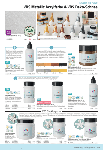 Dekobeispiel mit VBS Silikon-Vollform \von S. 8 und Kerafl ott Reliefgie%u00dfmasse von S. 9.Anleitung3534NEUVBS Deko-SchneeWei%u00dfe, grobk%u00f6rnige Strukturpaste. Eignet sich perfekt, um strukturierte Oberfl %u00e4cheneffekte wie Schnee zu erzeugen. Geruchsneutral, auf Wasserbasis.100 ml41278 693,491l=34,90230 ml41278 706,591l=28,651000 ml41278 7115,991l=15,99NEUVBS Deko-Schnee Liner, 80 mlWei%u00dfe Strukturpaste, die sich einfach mit der Linerfl asche auftragen l%u00e4sst. F%u00fcr schneeartige Effekte. Geruchsneutral, auf Wasserbasis.41278 723,491l=34,90NEUVBS Frost Effekt Liner, wei%u00df, 20 mlF%u00fcr einzigartigen Frost- oder Sandstrahleffekt. Auf Wasserbasis.41278 742,491l=124,50VBS Strukturpaste Grobe K%u00f6rnungGrobk%u00f6rnige, wei%u00dfe Paste. Geruchsneutral, auf Wasserbasis.230 ml41275 495,991l=26,041.000 ml41275 5014,991l=14,99VBS Strukturpaste Feine K%u00f6rnungFeink%u00f6rnige, wei%u00dfe Paste. Geruchsneutral, auf Wasserbasis.230 ml41275 515,991l=26,041.000 ml41275 5214,991l=14,99VBS Strukturpaste \Wei%u00dfe Paste. Geruchsneutral, auf Wasserbasis.41275 535,991l=26,04Kreativ mit Farbe| 49www.vbs-hobby.comErl%u00e4uterungen zu Icons und Artikeleigenschaften auf S. 57BESTSELLERDiamant-Schnee, ca. 100 gMit Glitzereffekt. Aus Kunststoff.41436 8923,292,391kg=23,90NEUyauch f%u00fcr Glas geeignetVBS Deko-Schnee Glitter, 100 mlWei%u00dfe Strukturpaste mit funkelndem Glitter. Auf Wasserbasis.41278 734,991l=49,90NEUVBS Acryl Metallic, 50 mlBesonders hoch pigmentiert, deckend und trocknet zu einer gl%u00e4nzenden Metallic-Oberfl %u00e4che auf. Geruchsneutral, auf Wasserbasis.Je Farbe5,391l=107,80AntikkupferBronzeAntikbronzeGraphit41278 6541278 6341278 6441278 68SilberAntiksilberAntikgoldGold41278 6641278 6741278 6241278 61-27%Die Farbe ist ideal f%u00fcr durchsichtige Oberfl %u00e4chen wie Acrylglas, Glas und Folien geeignet. Einfach mit einem Schwammpinsel sanft auftupfen oder mit einem Pinsel kunstvolle Muster gestalten. VBS Strukturpaste VBS Metallic Acrylfarbe & VBS Deko-Schnee Unsere neue VBS Acryl Metallic ist ideal f%u00fcr das Bemalen von Holz, Stein, Papier und Metall geeignet. Die Oberfl %u00e4che sollte trocken, staub- und fettfrei sein. Einfach mit einem Pinsel, Schwamm oder Stupfpinsel auftragen und nach Belieben untereinander mischen, um eigene Farbt%u00f6ne zu kreieren!Unsere neue VBS Strukturpaste ist vielseitig einsetzbar und eignet sich hervorragend f%u00fcr Materialien wie Holz, MDF, Papier, Pappe, Leinwand, Keramik und Styropor. Nach dem Trocknen, das je nach Auftrag variiert, kann die Paste problemlos mit Acrylfarbe %u00fcbermalt werden. Sie l%u00e4sst sich einfach mit Pinsel oder Spachtel auftragen und ist sowohl lichtecht als auch geruchsneutral.Einfach mit einem Pinsel oder Spachtel auftragen. Die Oberfl %u00e4che sollte sauber, fettfrei und trocken sein. Ideal f%u00fcr Holz, MDF, Papier, Leinwand, Keramik, Styropor geeignet.
