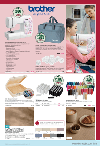 -20%-16%brother N%u00e4hmaschine Little Angel KE14SF%u00fcr N%u00e4heinsteiger ab 14 Jahren, unkompliziert in der Bedienung. Inklusive Fingerschutz.Technische Daten:- Gewicht: ca. 5,4 kg- Bedienungsanleitung auf DVD und in Papierform (Deutsch, Franz%u00f6sisch, Italienisch)- 14 Stichprogramme- 4 Stufen-Knopfl ochautomatik- 750 Stiche/Minute- 6-Punkt-Transporteur- Klemmfreier Horizontalgreifer- Fadenspannung einstellbar- Freiarmn%u00e4hen- R%u00fcckw%u00e4rtsn%u00e4hen- Stichl%u00e4nge bis 4 mm, - Stichbreite bis 5 mm- Aufspulautomatik- LED-Beleuchtung- Fingerschutz 41393 652119,0094,99brother Tragetasche f%u00fcr N%u00e4hmaschinenPassend f%u00fcr die N%u00e4hmaschinen-Modelle: Little Angel, RL417, RL425, HF37, CS10, f%u00fcr das Overlook-Modell M343D sowie f%u00fcr alle FS Modelle. Ca. L 42 x B 12 x H 30 cm. Aus Polyester.41394 58135,9030,00VBS N%u00e4hgarn HolzkofferMit herausnehmbarer Einlegeplatte und Holzstiften f%u00fcr max. 64 N%u00e4hgarnspulen. Ca. L 31,5 x B 31,5 x H 8 cm. Lieferung erfolgt ohne N%u00e4hgarnrollen. Aus Rohholz.41389 78529,95VBS N%u00e4hgarn, 36 Spulen36 Spulen %u00e0 100 m. Aus Polyester.Wei%u00df41393 515 016,594,991m=0,01Schwarz41393 515 026,591m=0,01VBS N%u00e4hgarn-Set, 39-tlg.39 verschiedene, unsortierte Farben. Je Spule ca. 70 m. Aus 100 % Polyester.41392 8226,494,991m=0,01NEUMeterware Musselin \130 g/m%u00b2, B ca. 130 cm, weich und kuschelig, waschbar bei 30 %u00b0C Feinw%u00e4sche. Aus 100 % Baumwolle.Ab 0.2 m in 0.1 m-Schritten bestellbar.Je Farbe8,49/m1m%u00b2=6,53brother Unterfaden-Spulen, 10 St%u00fcckErsparen das ewige Auf- und Abspulen des Garns. Passend f%u00fcr brother N%u00e4hmaschinen. H ca. 11,5 mm. Aus Kunststoff.41394 5747,90| 55www.vbs-hobby.comErl%u00e4uterungen zu Icons und Artikeleigenschaften auf S. 57Ecru-Wei%u00dfLeinen-BeigeBlushFlieder41211 5841285 0241211 6241211 60Baltic-BlauLatteGrauSchwarz41211 6141284 9941285 0041285 01DekobeispielDekobeispiel-24%-23%Perfekt zum Kombinieren mit den Musselinstoffen \ Punkte\