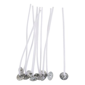 Gewachste Kerzendochte mit Metallfuß in einer Länge von ca. 9 cm. Die 10 Dochte haben zusätzlich eine Papiereinlage eingearbeitet, wodurch sich die Brenneigenschaft besonders für pflanzliches Wachs verbessert. Der Docht hat eine Stärke von ca. 2 mm und das Metallplättchen hat einen Ø von ca. 15 mm.