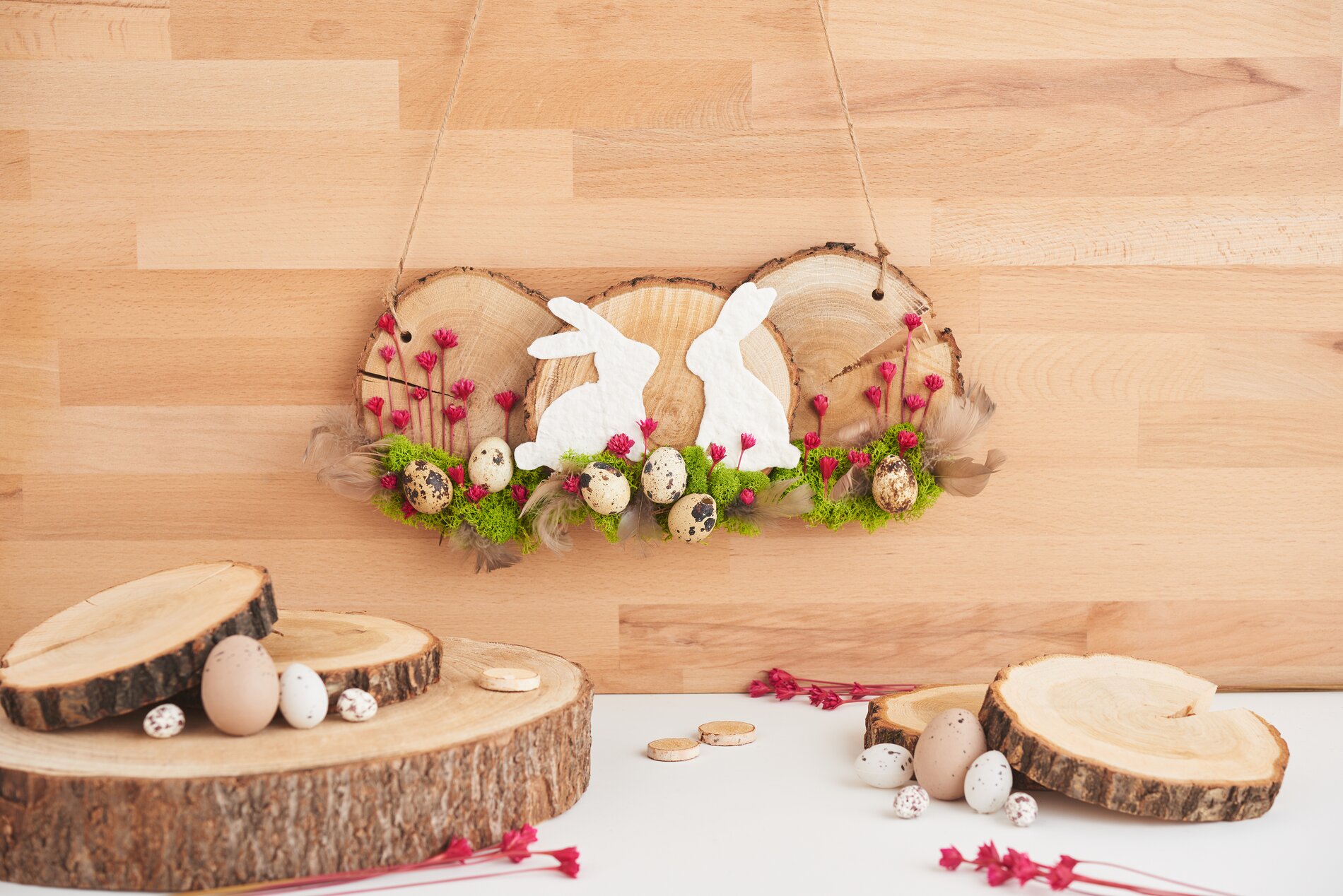 Klebe Islandmoos, kleine Blüten, Gänsefedern und Wachteleier auf die Holzscheiben für ein einzigartiges Design.