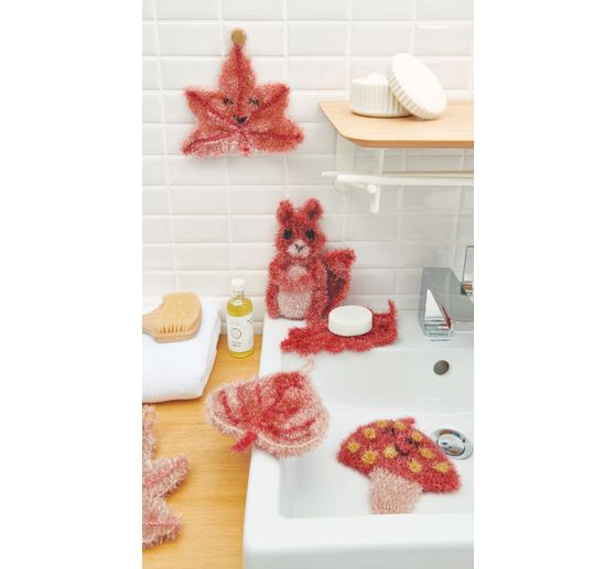 Das Garn besteht aus 100% Polyester und hat mit seinen 50 Gramm pro Knäul eine Lauflänge von 90 m. Die robusten Eigenschaften des Garns verleihen ihm ein etwas kratziges Gefühl, ist dabei aber gleichzeitig sehr weich und angenehm anzufassen. Das Garn kann bei 60°C gewaschen werden, damit die Schwämme auch für längere Zeit verwendet werden können.