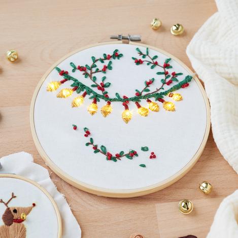 Jetzt geht es ans Sticken der Motive. Folge den Konturen, die du im ersten Schritt auf den Stoff übertragen hast, und lasse deiner Kreativität freien Lauf. Verwende unterschiedliche Sticktechniken, um deinen Motiven Tiefe und Textur zu verleihen. Und sticke dabei auch über die LED-Birnchen.